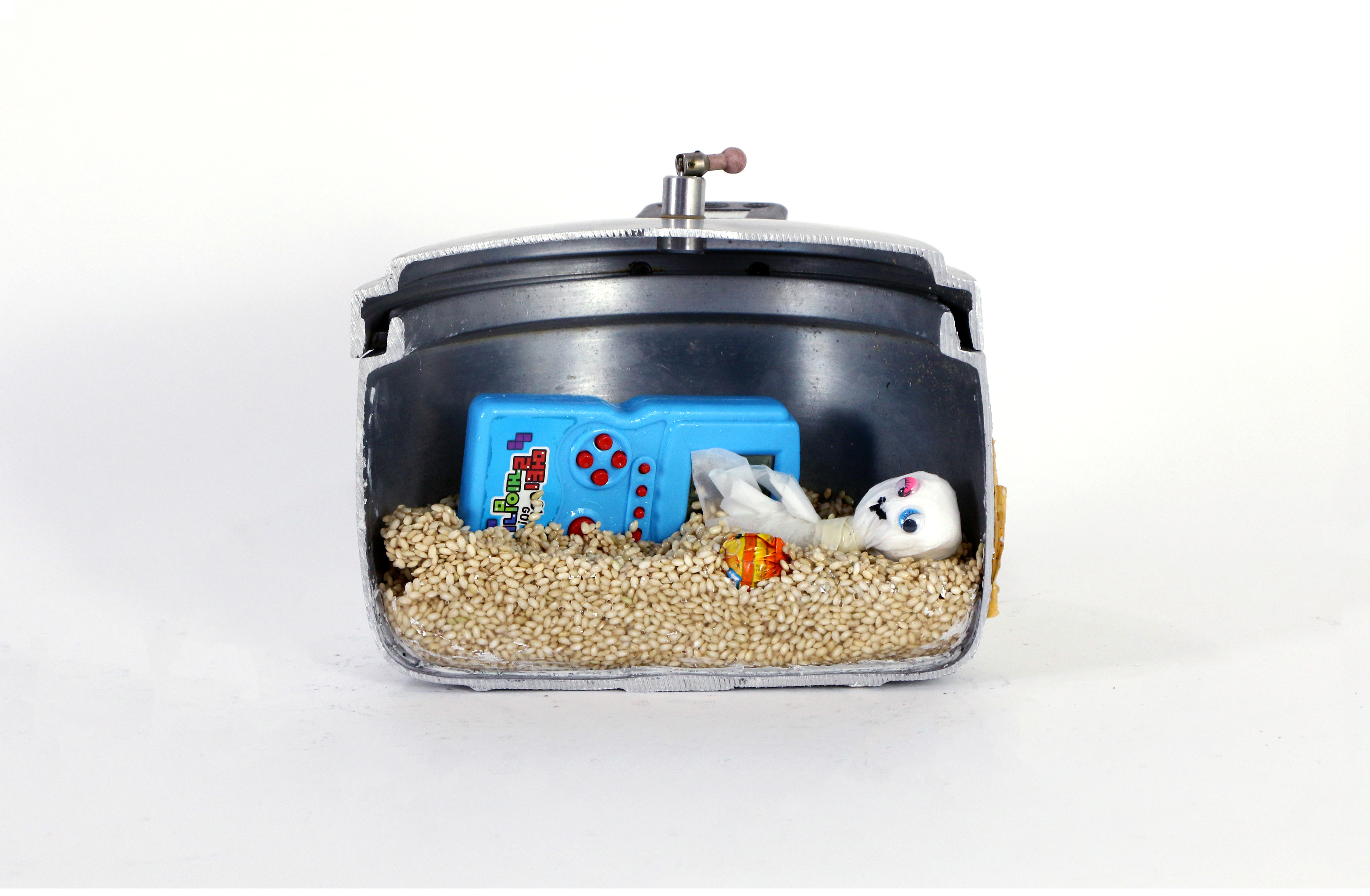 In South Korea, children born in prison under parents in the criminal justice system are often subjects to misjudgment and discrimination. During the past summer, I participated in an exhibition held by Seum Corporation, a non-profit organization that brings awareness to the children of inmates. This exhibition gave me an opportunity to find creative solutions that can be used as powerful tools to change people’s mindsets and bring attention to the hidden realities occurring in our society. With my piece, I wanted to represent care that exists in a home through the concept of food. By emphasizing the contrast between the appearance of the two rice cookers and the rice grain inside, I wanted to illustrate the gap between a normal household and those of the children in need of aid. The rice symbolizes nourishment but also the difference in social status.Mixed media, resin, rice grains