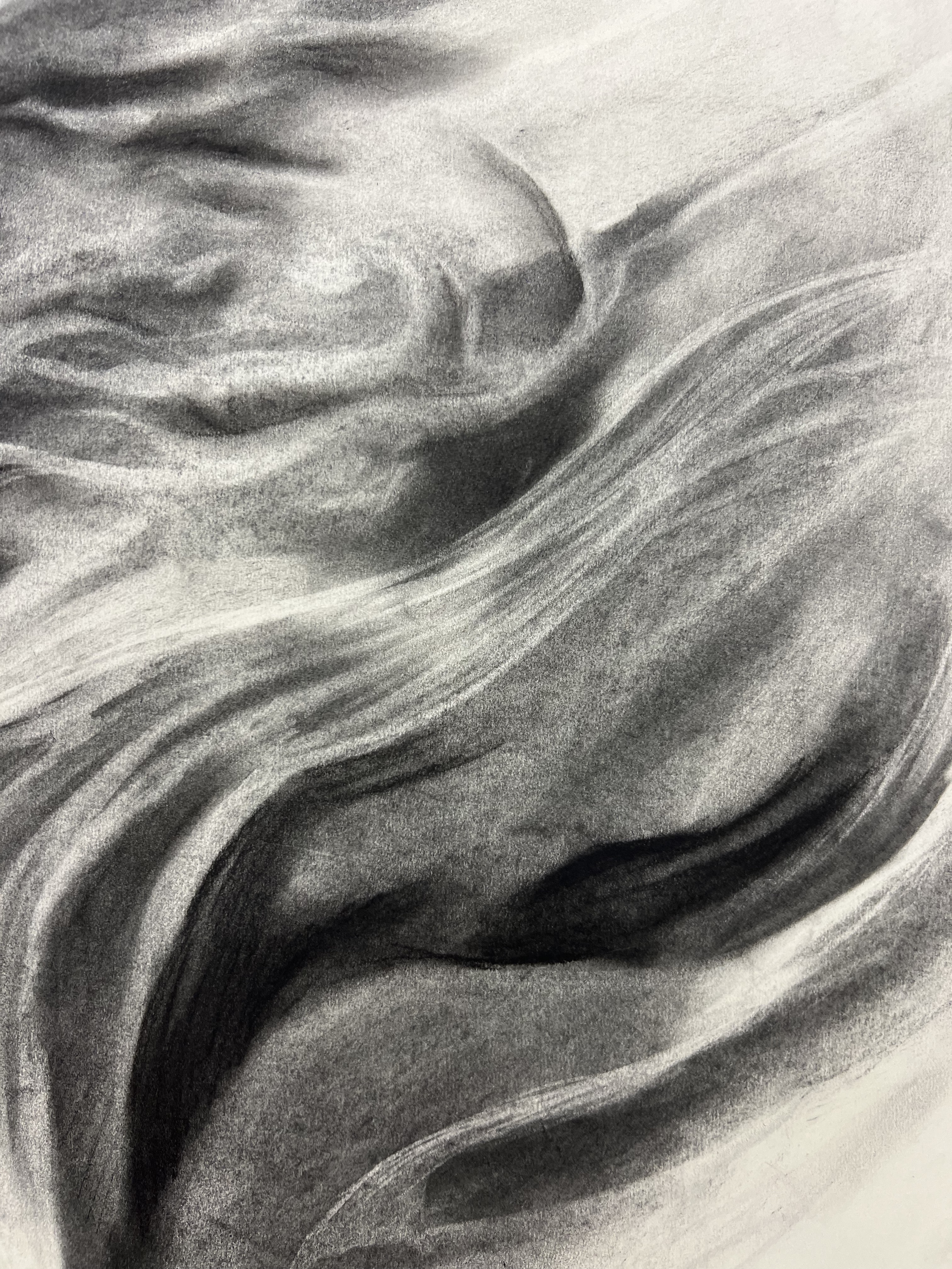 In South Korea, there is a national tradition to eat seaweed soup on the morning of your birthday. Traditionally the soup symbolizes and honors Samsin Halmoni, a goddess who helps women through pregnancy and childbirth. Essentially, people consuming the soup on their birthdays are honoring their mothers for giving birth to them as well as for their own luck and prosperity for future children. In my piece, my drawings challenge this conventional narrative, urging viewers to reconsider the complexities of maternal sacrifice. Instead of me, the child, eating the seaweed soup, the drawing depicts my mother submerged in tangled seaweed. She willingly drowns in and emerges from it as she is weighed down by the heavy weight of the water, representing the consumption of her own well-being. Only on the morning of my birthday, my working mother would spend time cooking the seaweed soup for me in attempts to express her love.Graphite and charocal on paper, additional sound element
